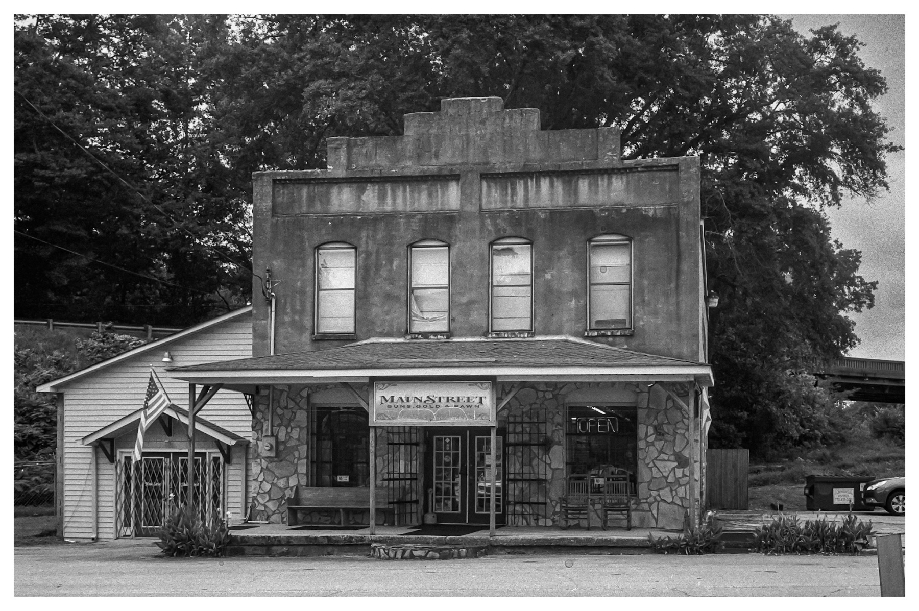 Walking through the older parts of Hiram, you can almost hear the whistle of a steam engine. The architecture, though subtly blended with modern developments, still whispers tales of a bygone era. I found myself drawn to the texture of weathered brick and the intricate details of older storefronts. Ilford 100, with its fine grain and sharp contrast, was perfect for capturing the gravitas of these historical elements, allowing the light and shadow to play a dramatic role in telling their story.